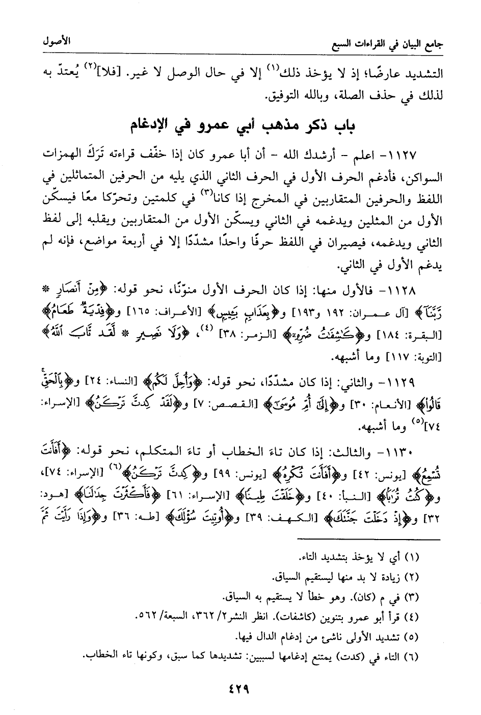 1127 - اعلم- أرشدك الله- أن أبا عمرو كان إذا خفّف قراءته ترك الهمزات السواكن، فأدغم الحرف الأول في الحرف الثاني الذي يليه من الحرفين المتماثلين في اللفظ والحرفين المتقاربين في المخرج إذا كانا «3» في كلمتين وتحرّكا معا فيسكّن الأول من المثلين ويدغمه في الثاني ويسكّن الأول من المتقاربين ويقلبه إلى لفظ الثاني ويدغمه، فيصيران في اللفظ حرفا واحدا مشدّدا إلا في أربعة مواضع، فإنه لم يدغم الأول في الثاني.