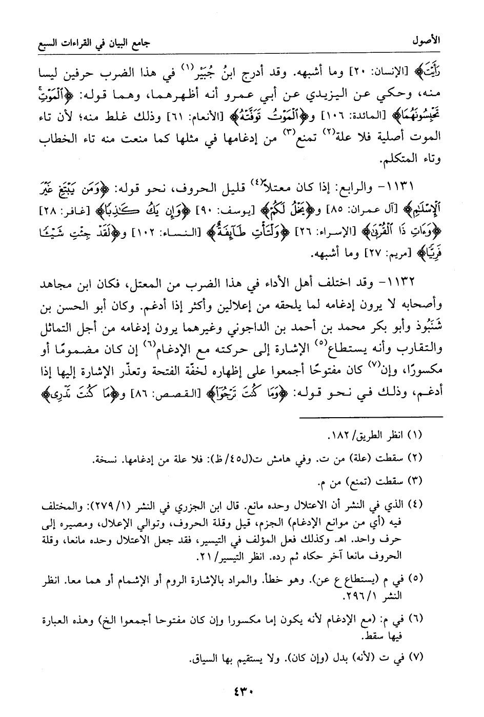 (4) الذي في النشر أن الاعتلال وحده مانع. قال ابن الجزري في النشر (1/ 279): والمختلف فيه (أي من موانع الإدغام) الجزم، قيل وقلة الحروف، وتوالي الإعلال، ومصيره إلى حرف واحد. اهـ. وكذلك فعل المؤلف في التيسير، فقد جعل الاعتلال وحده مانعا، وقلة الحروف مانعا آخر حكاه ثم رده. انظر التيسير/ 21.