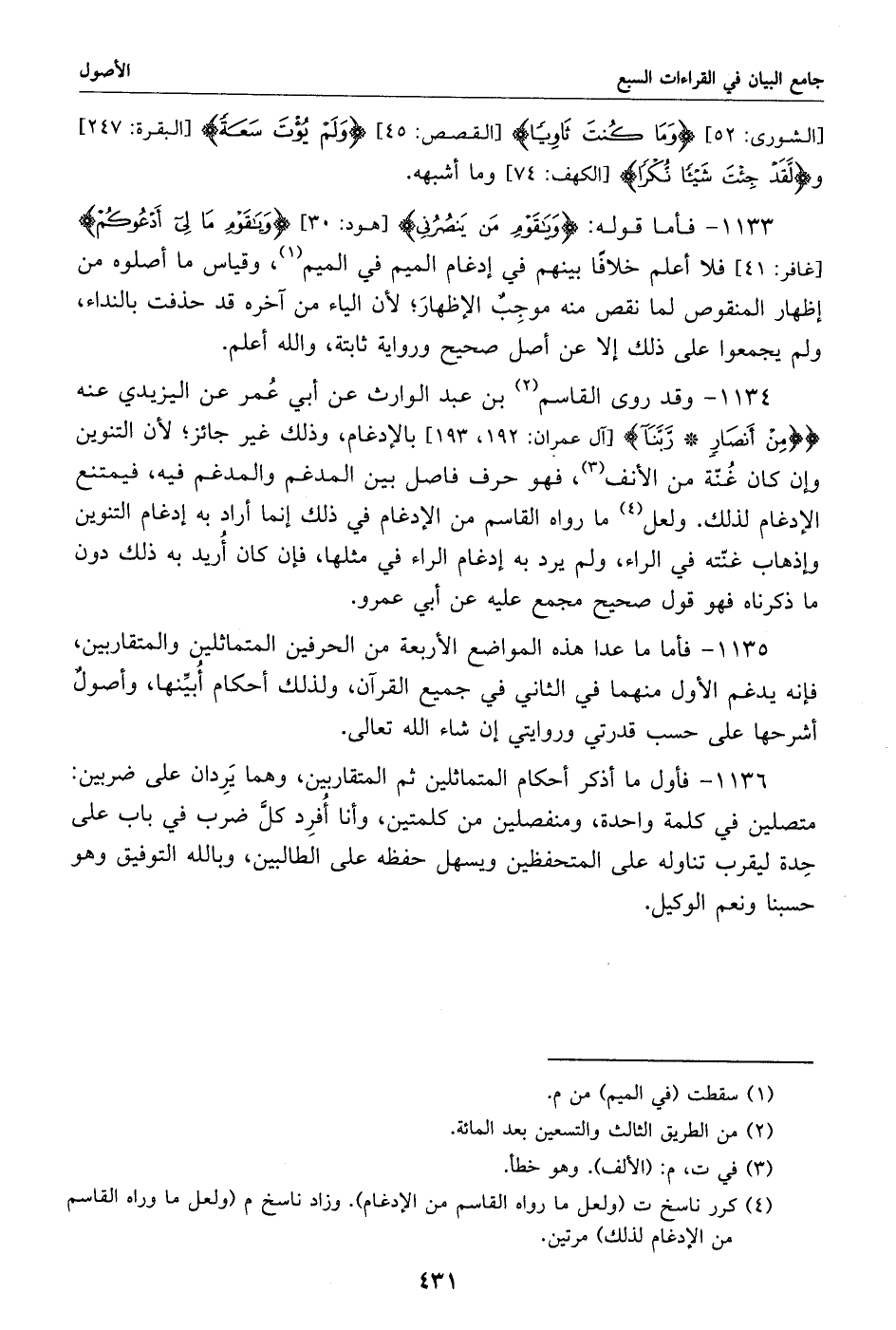 1135 - فأما ما عدا هذه المواضع الأربعة من الحرفين المتماثلين والمتقاربين، فإنه يدغم الأول منهما في الثاني في جميع القرآن، ولذلك أحكام أبيّنها، وأصول أشرحها على حسب قدرتي وروايتي إن شاء الله تعالى.