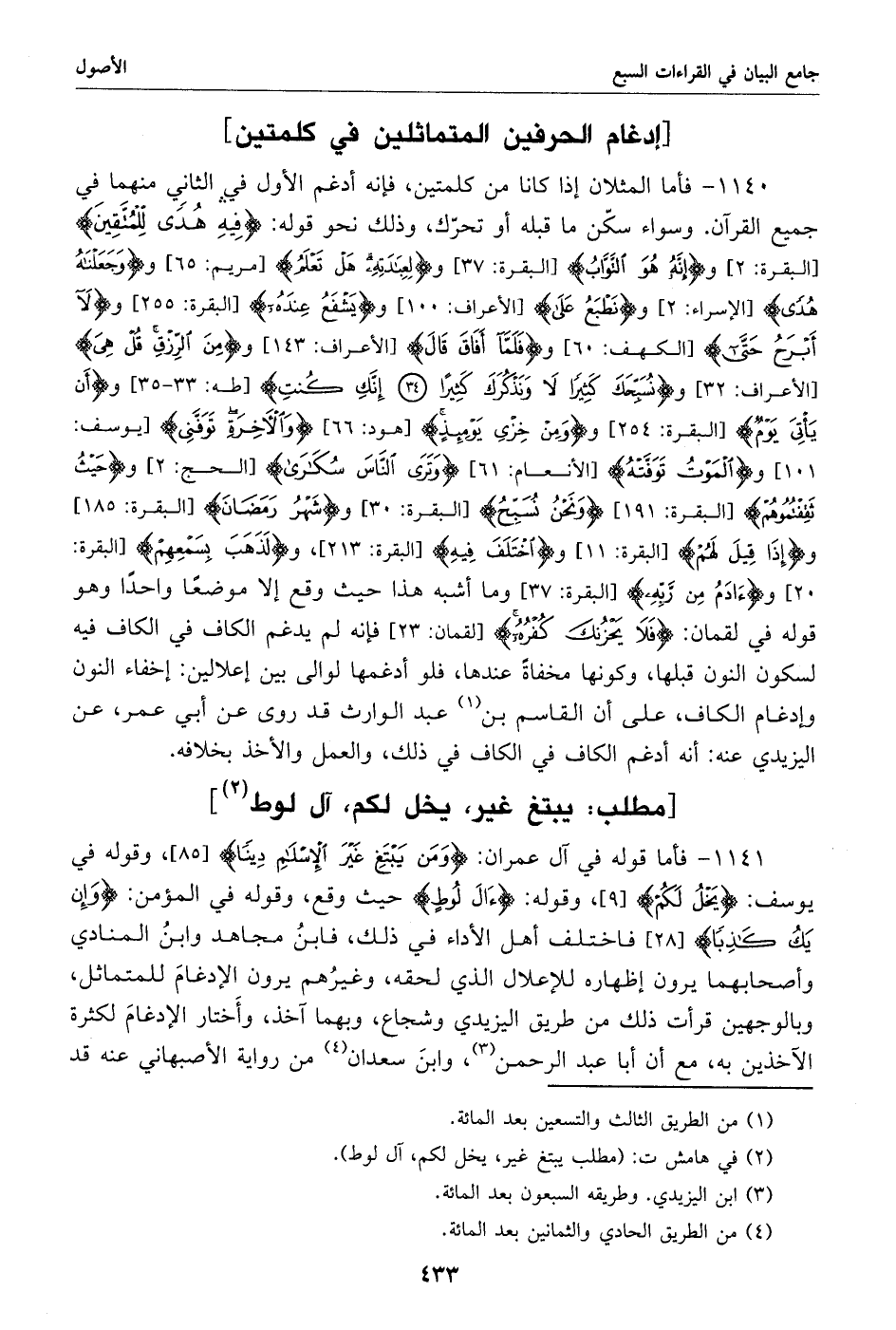 1141 - فأما قوله في آل عمران: ومن يبتغ غير الإسلم دينا [85]، وقوله في يوسف: يخل لكم [9]، وقوله: ءال لوط حيث وقع، وقوله في المؤمن: وإن يك كذبا [28] فاختلف أهل الأداء في ذلك، فابن مجاهد وابن المنادي وأصحابهما يرون إظهاره للإعلال الذي لحقه، وغيرهم يرون الإدغام للمتماثل، وبالوجهين قرأت ذلك من طريق اليزيدي وشجاع، وبهما آخذ، وأختار الإدغام لكثرة الآخذين به، مع أن أبا عبد الرحمن «3»، وابن سعدان «4» من رواية الأصبهاني عنه قد