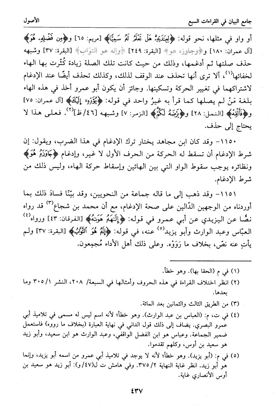 1151 - وقد ذهب إلى ما قاله جماعة من النحويين، وقد بيّنّا فساد ذلك بما أوردناه من الوجهين الدّالين على صحة الإدغام، مع أن محمد بن شجاع «3» قد رواه نصّا عن اليزيدي عن أبي عمرو في قوله: إلهه هوئه [الفرقان: 43] ورواه «4» العبّاس وعبد الوارث وأبو يزيد «5» عنه، في قوله: إنّه هو التّوّاب [البقرة: 37] ولم يأت عنه نصّ، بخلاف ما رووه. وعلى ذلك أهل الأداء مجمعون.