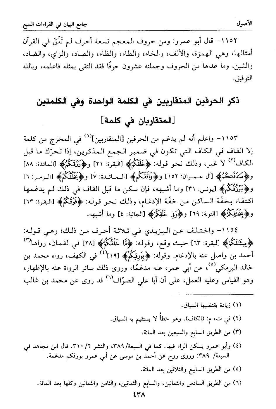 1153 - واعلم أنه لم يدغم من الحرفين [المتقاربين] «1» في المخرج من كلمة إلا القاف في الكاف التي تكون في ضمير الجمع المذكرين، إذا تحرّك ما قبل الكاف «2» لا غير، وذلك نحو قوله: خلقكم [البقرة: 21] ورزقكم [المائدة: 88] وصدقكم [آل عمران: 152] وواثقكم [المائدة: 7] ويخلقكم [الزمر: 6] ويرزقكم [يونس: 31] وما أشبهه، فإن سكن ما قبل القاف في ذلك لم يدغمها اكتفاء بخفّة الساكن من خفّة الإدغام، وذلك نحو قوله: فوقكم [البقرة: 63] ويخلقكم [التوبة: 69] وو في خلقكم [الجاثية: 4] وما أشبهه.