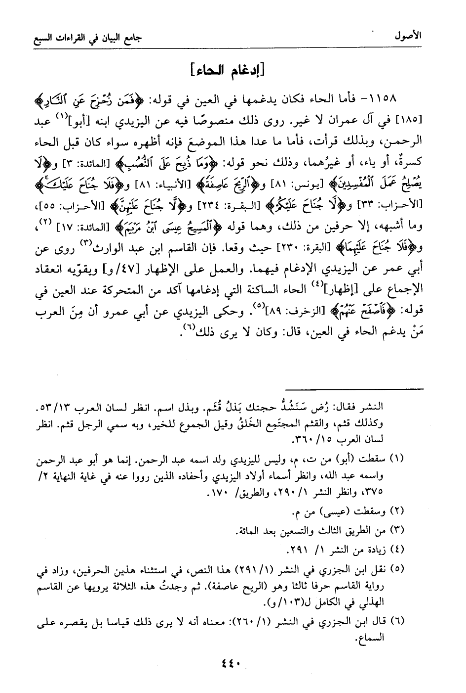 1158 - فأما الحاء فكان يدغمها في العين في قوله: فمن زحزح عن النّار [185] في آل عمران لا غير. روى ذلك منصوصا فيه عن اليزيدي ابنه [أبو] «1» عبد الرحمن، وبذلك قرأت، فأما ما عدا هذا الموضع فإنه أظهره سواء كان قبل الحاء كسرة، أو ياء، أو غيرهما، وذلك نحو قوله: وما ذبح على النّصب [المائدة: 3] ولا يصلح عمل المفسدين [يونس: 81] والرّيح عاصفة [الأنبياء: 81] وفلا جناح عليك [الأحزاب: 33] ولّا جناح عليكم [البقرة: 234] ولّا جناح عليهنّ [الأحزاب: 55]، وما أشبهه، إلا حرفين من ذلك، وهما قوله المسيح عيسى ابن مريم [المائدة: 17] «2»، وفلا جناح عليهما [البقرة: 230] حيث وقعا. فإن القاسم ابن عبد الوارث «3» روى عن أبي عمر عن اليزيدي الإدغام فيهما. والعمل على الإظهار [47/ و] ويقوّيه انعقاد الإجماع على [إظهار] «4» الحاء الساكنة التي إدغامها آكد من المتحركة عند العين في قوله: فاصفح عنهم [الزخرف: 89] «5». وحكى اليزيدي عن أبي عمرو أن من العرب من يدغم الحاء في العين، قال: وكان لا يرى ذلك «6».