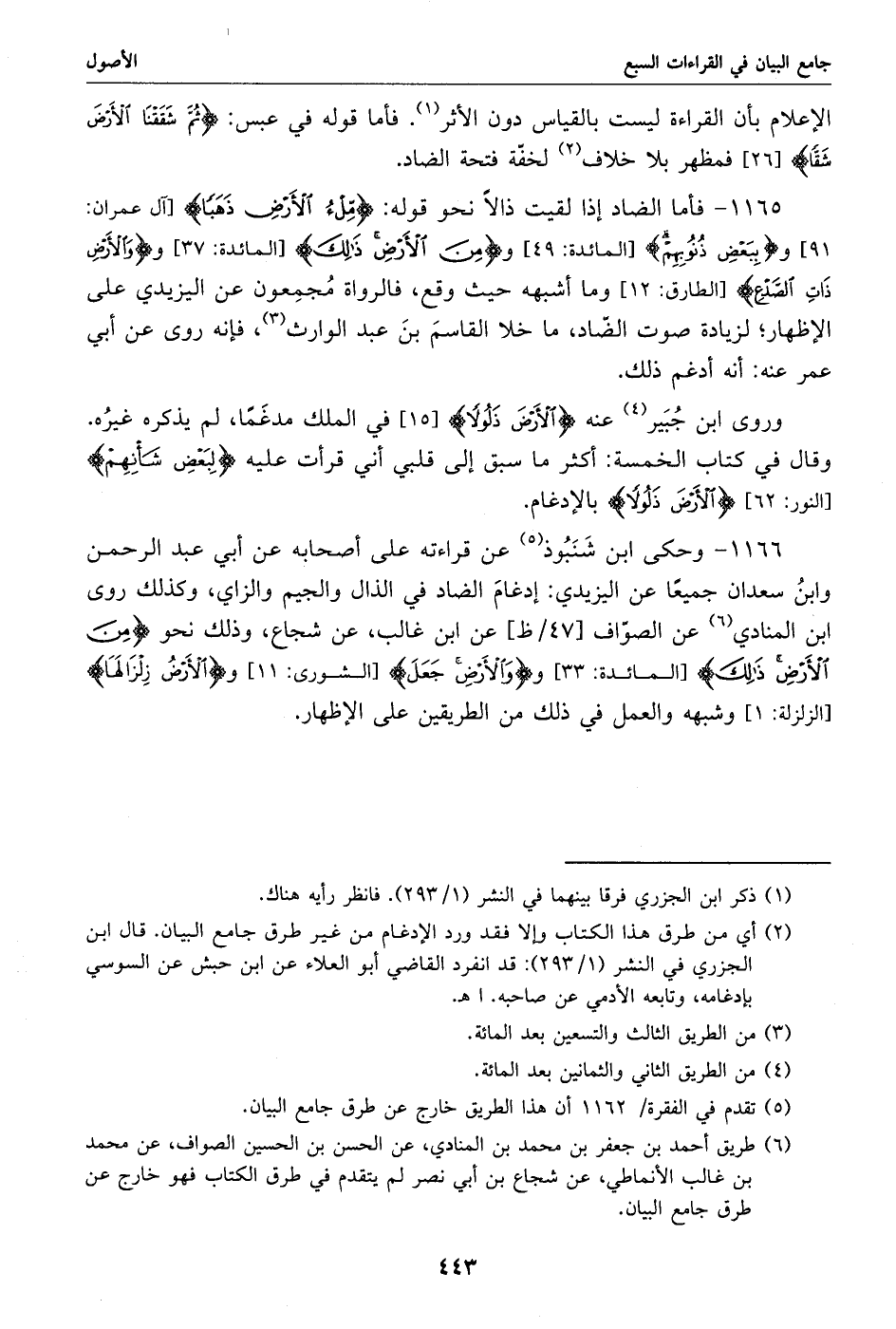 (2) أي من طرق هذا الكتاب وإلا فقد ورد الإدغام من غير طرق جامع البيان. قال ابن الجزري في النشر (1/ 293): قد انفرد القاضي أبو العلاء عن ابن حبش عن السوسي بإدغامه، وتابعه الأدمي عن صاحبه. اهـ.