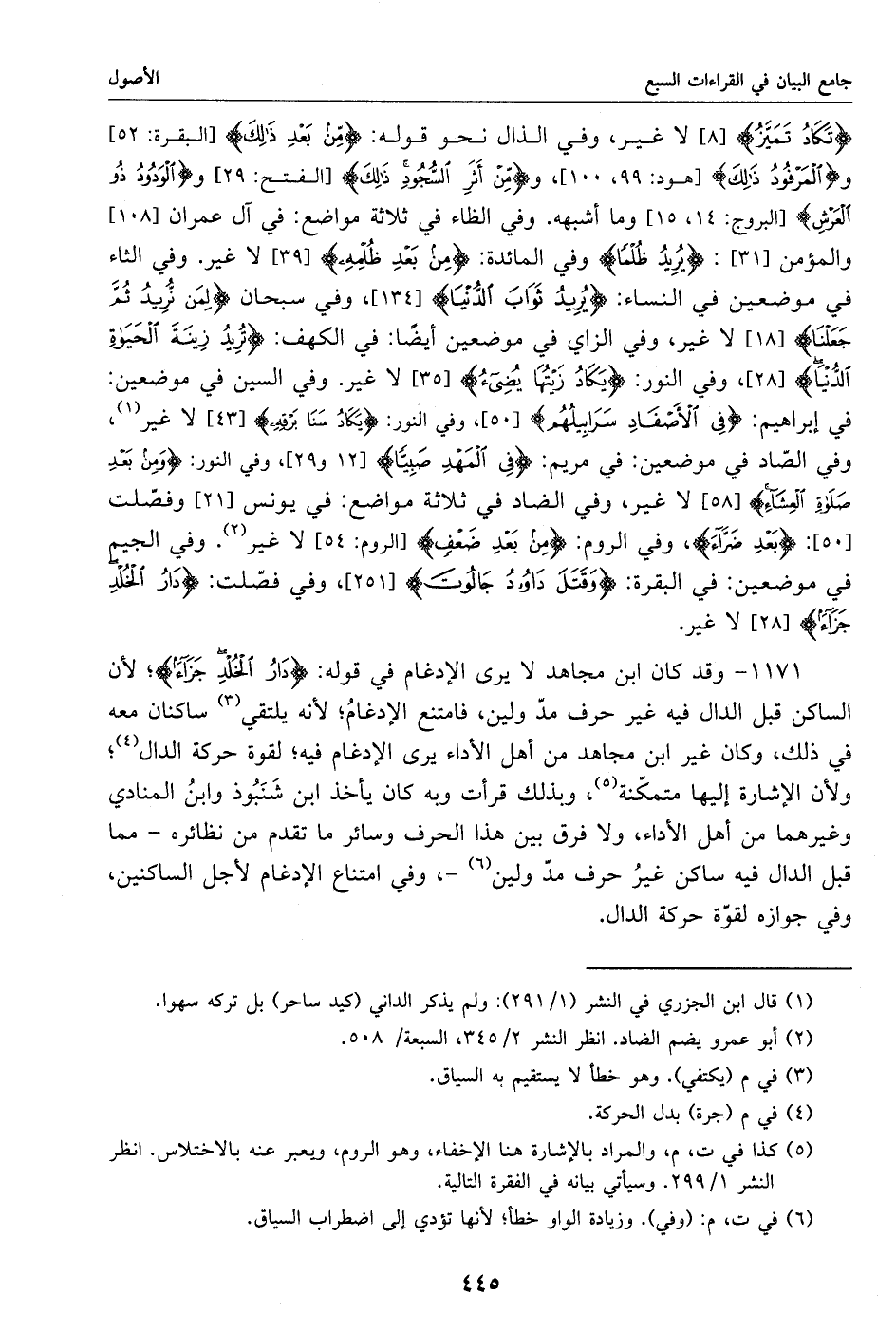 تكاد تميّز [8] لا غير، وفي الذال نحو قوله: مّن بعد ذلك [البقرة: 52] والمرفود ذلك [هود: 99، 100]، ومّن أثر السّجود ذلك [الفتح: 29] والودود ذو العرش [البروج: 14، 15] وما أشبهه. وفي الظاء في ثلاثة مواضع: في آل عمران [108] والمؤمن [31]: يريد ظلما وفي المائدة: من بعد ظلمه [39] لا غير. وفي الثاء في موضعين في النساء: يريد ثواب الدّنيا [134]، وفي سبحان لمن نّريد ثمّ جعلنا [18] لا غير، وفي الزاي في موضعين أيضا: في الكهف: تريد زينة الحيوة الدّنيا [28]، وفي النور: يكاد زيتها يضىء [35] لا غير. وفي السين في موضعين: