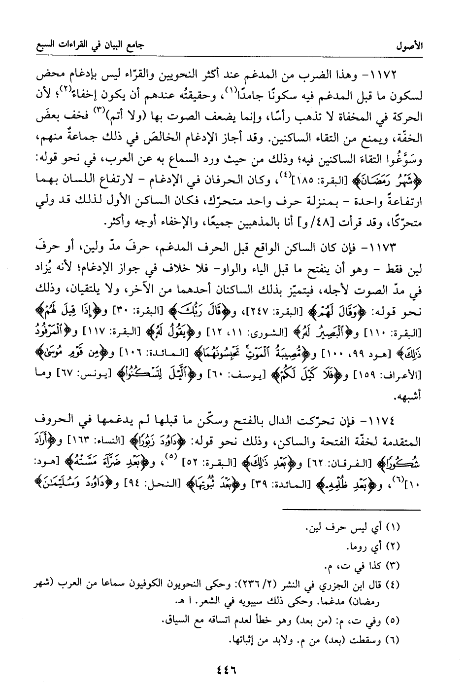 1173 - فإن كان الساكن الواقع قبل الحرف المدغم، حرف مدّ ولين، أو حرف لين فقط- وهو أن ينفتح ما قبل الياء والواو- فلا خلاف في جواز الإدغام؛ لأنه يزاد في مدّ الصوت لأجله، فيتميّز بذلك الساكنان أحدهما من الآخر، ولا يلتقيان، وذلك نحو قوله: وقال لهم [البقرة: 247]، وقال ربّك [البقرة: 30] وإذا قيل لهم [البقرة: 110] والبصير له [الشورى: 11، 12] ويقول له [البقرة: 117] والمرفود ذلك [هود 99، 100] ومّصيبة الموت تحبسونهما [المائدة: 106] ومن قوم موسى [الأعراف: 159] وفلا كيل لكم [يوسف: 60] والّيل لتسكنوا [يونس: 67] وما أشبهه.