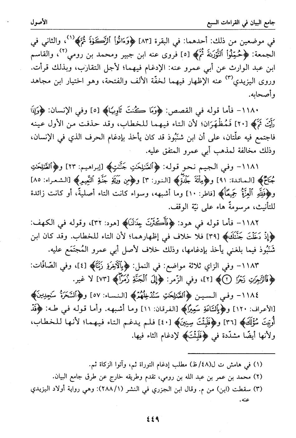 في موضعين من ذلك: أحدهما: في البقرة [83] وءاتوا الزّكوة ثمّ «1»، والثاني في الجمعة: حمّلوا التّورئة ثمّ [5] فروى عنه ابن جبير ومحمد بن رومي «2»، والقاسم ابن عبد الوارث عن أبي عمرو عنه: الإدغام فيهما؛ لأجل التقارب، وبذلك قرأت.