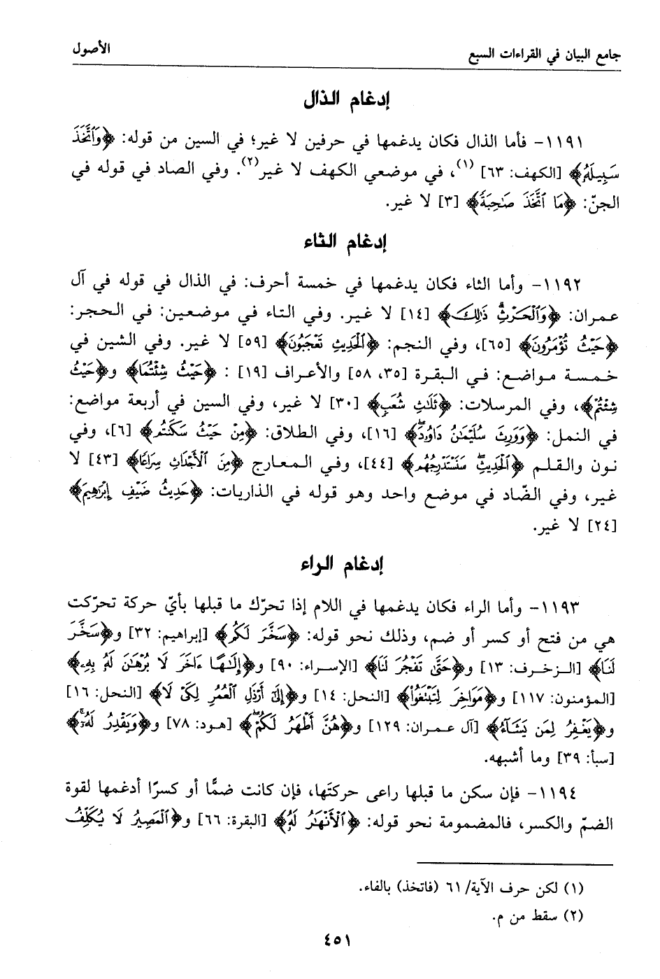 1192 - وأما الثاء فكان يدغمها في خمسة أحرف: في الذال في قوله في آل عمران: والحرث ذلك [14] لا غير. وفي التاء في موضعين: في الحجر:
