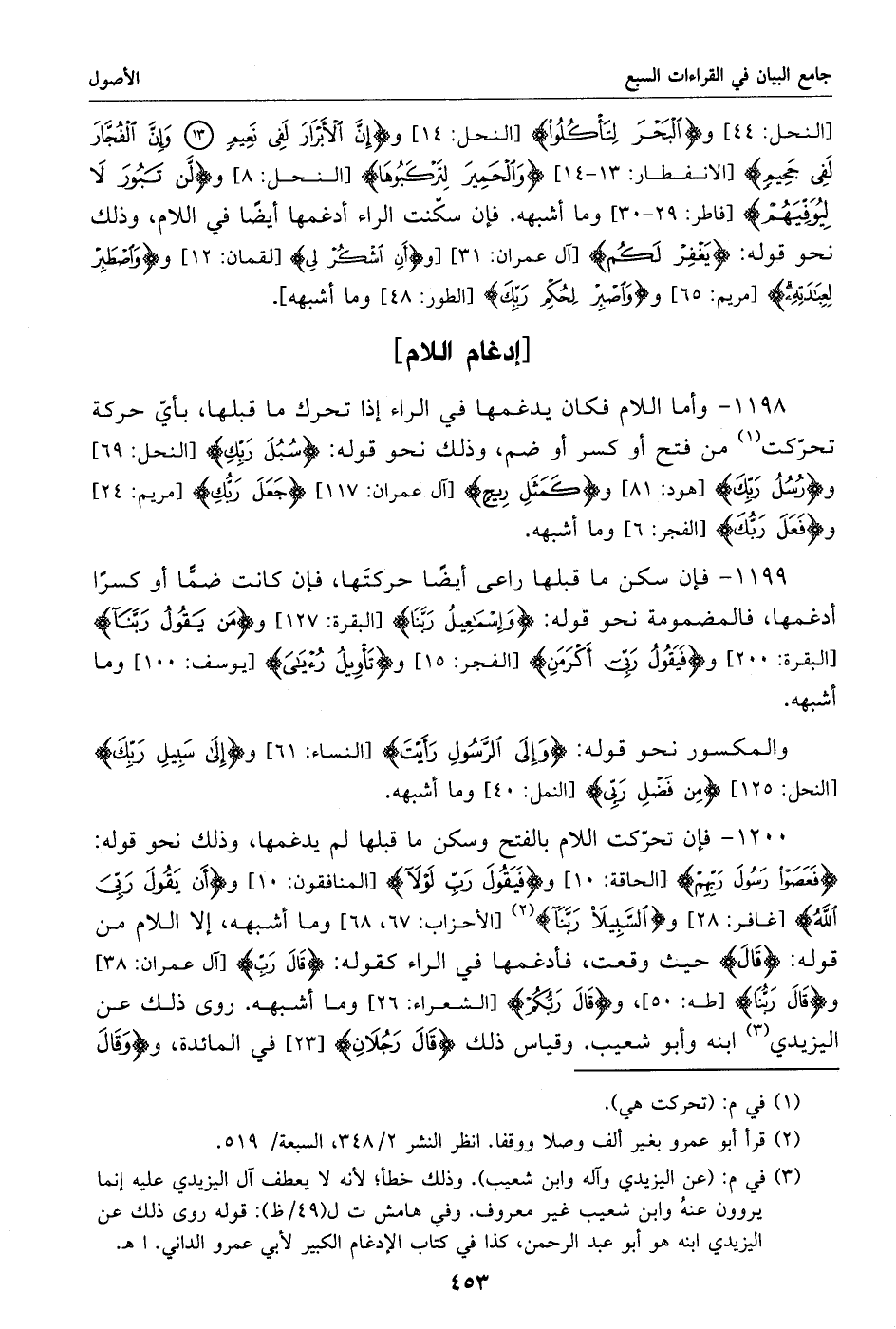 (3) في م: (عن اليزيدي وآله وابن شعيب). وذلك خطأ؛ لأنه لا يعطف آل اليزيدي عليه إنما يروون عنه وابن شعيب غير معروف. وفي هامش ت ل (49/ ظ): قوله روى ذلك عن اليزيدي ابنه هو أبو عبد الرحمن، كذا في كتاب الإدغام الكبير لأبي عمرو الداني. اهـ.