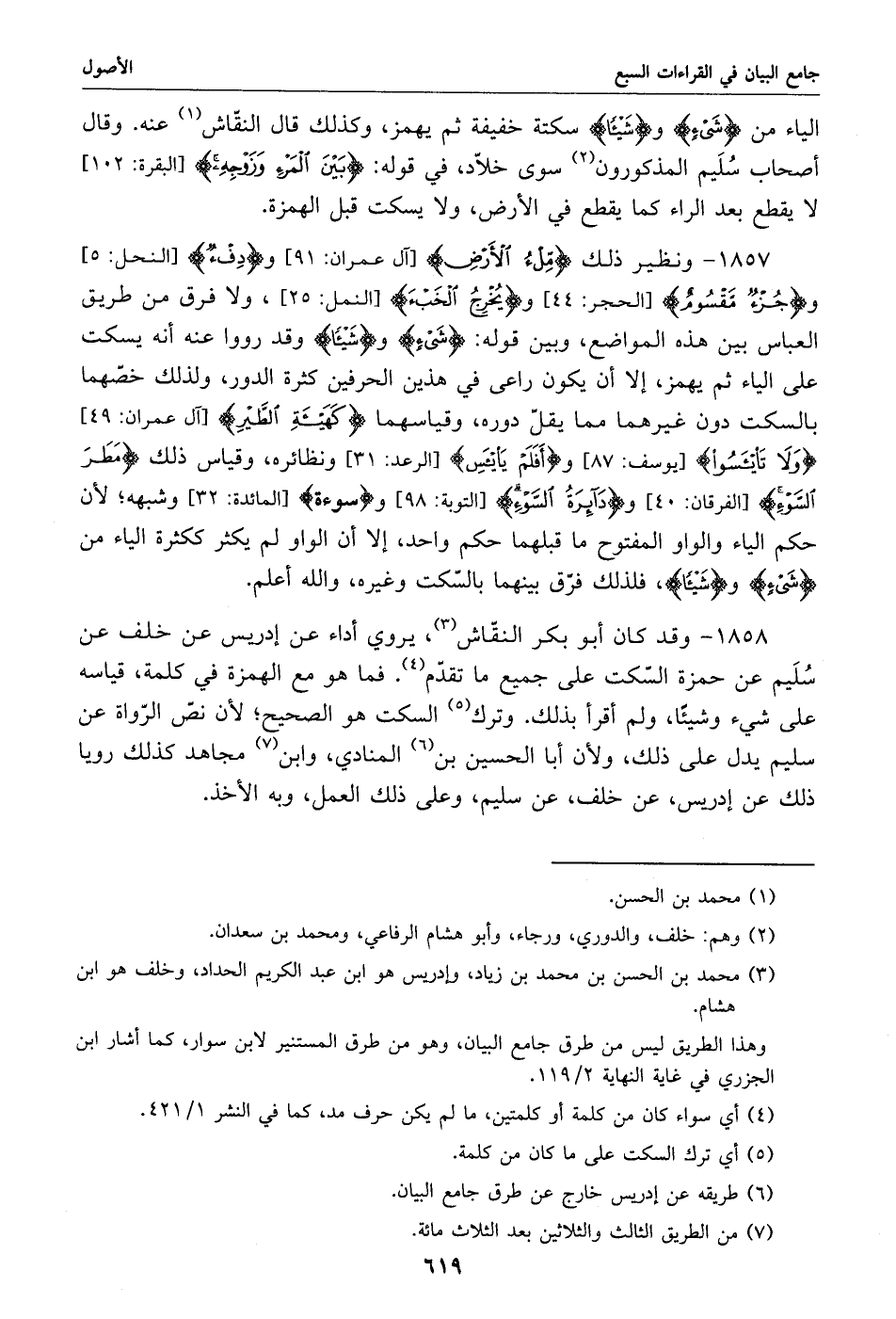 1858 - وقد كان أبو بكر النقّاش «3»، يروي أداء عن إدريس عن خلف عن سليم عن حمزة السّكت على جميع ما تقدّم «4». فما هو مع الهمزة في كلمة، قياسه على شيء وشيئا، ولم أقرأ بذلك. وترك «5» السكت هو الصحيح؛ لأن نصّ الرّواة عن سليم يدل على ذلك، ولأن أبا الحسين بن «6» المنادي، وابن «7» مجاهد كذلك رويا ذلك عن إدريس، عن خلف، عن سليم، وعلى ذلك العمل، وبه الأخذ.