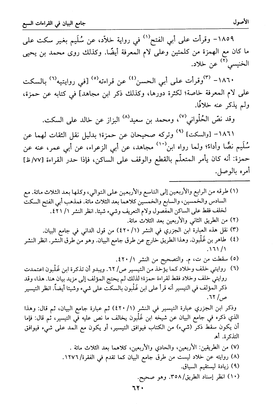 1860 - «3» وقرأت على أبي الحسن «4» عن قراءته «5» [في روايتيه «6» بالسكت على لام المعرفة خاصة؛ لكثرة دورها، وكذلك ذكر ابن مجاهد] في كتابه عن حمزة، ولم يذكر عنه خلافا.