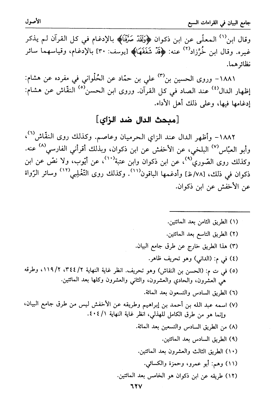 1882 - وأظهر الدال عند الزاي الحرميان وعاصم. وكذلك روى النقّاش «6»، وأبو العبّاس «7» البلخي، عن الأخفش عن ابن ذكوان، وبذلك أقرأني الفارسي «8» عنه.