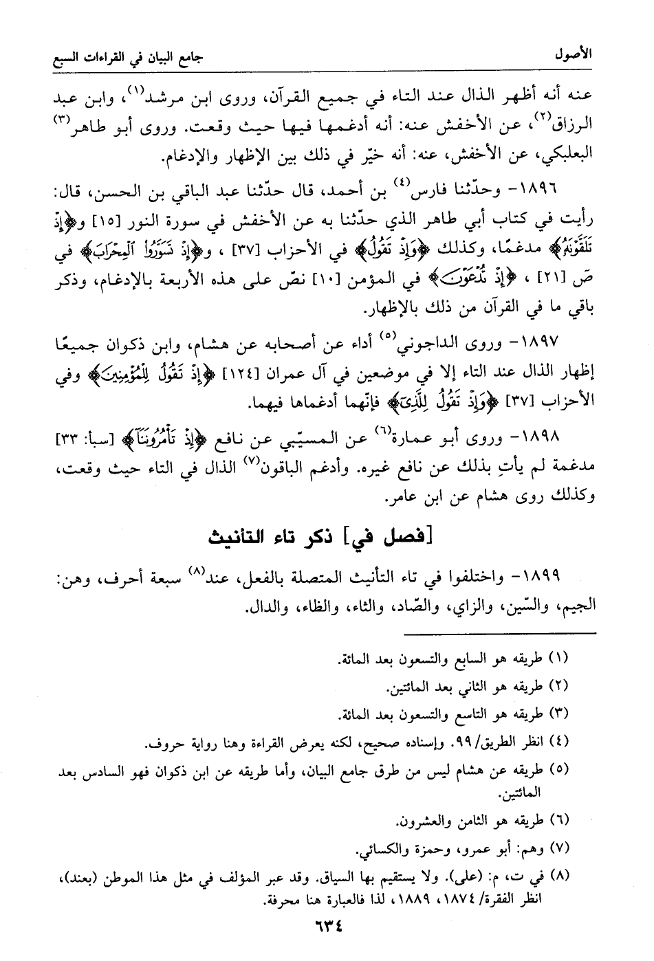 1897 - وروى الداجوني «5» أداء عن أصحابه عن هشام، وابن ذكوان جميعا إظهار الذال عند التاء إلا في موضعين في آل عمران [124] إذ تقول للمؤمنين وفي الأحزاب