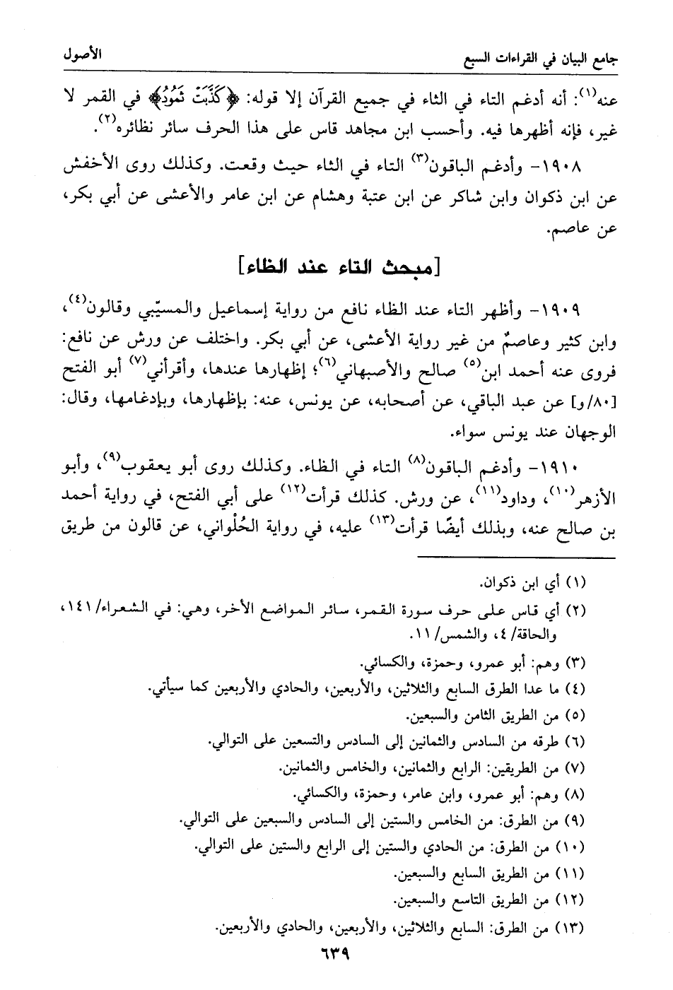 1909 - وأظهر التاء عند الظاء نافع من رواية إسماعيل والمسيّبي وقالون «4»، وابن كثير وعاصم من غير رواية الأعشى، عن أبي بكر. واختلف عن ورش عن نافع: