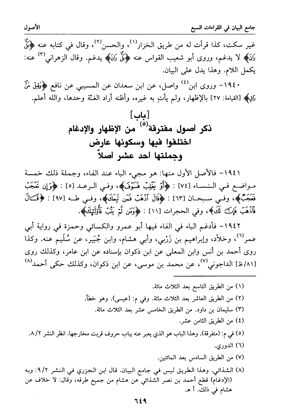(8) الشذائي. وهذا الطريق ليس في جامع البيان. قال ابن الجزري في النشر 2/ 9: وبه (الإدغام) قطع أحمد بن نصر الشذائي عن هشام من جميع طرقه، وقال: لا خلاف عن هشام في ذلك. أهـ.