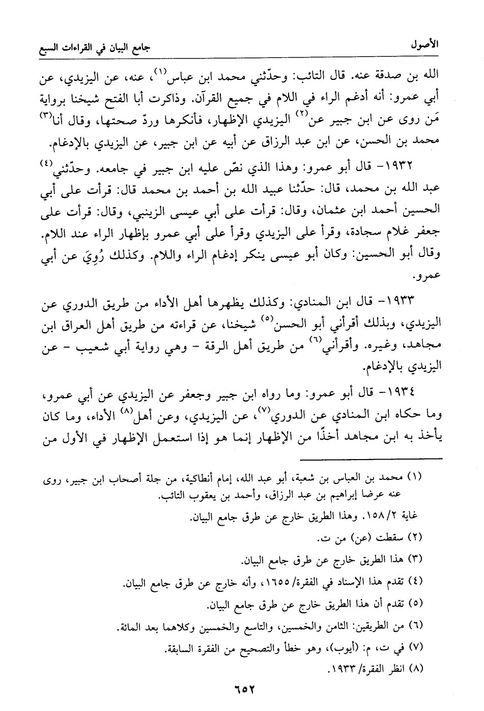 1932 - قال أبو عمرو: وهذا الذي نصّ عليه ابن جبير في جامعه. وحدّثني «4» عبد الله بن محمد، قال: حدّثنا عبيد الله بن أحمد بن محمد قال: قرأت على أبي الحسين أحمد ابن عثمان، وقال: قرأت على أبي عيسى الزينبي، وقال: قرأت على جعفر غلام سجادة، وقرأ على اليزيدي وقرأ على أبي عمرو بإظهار الراء عند اللام.