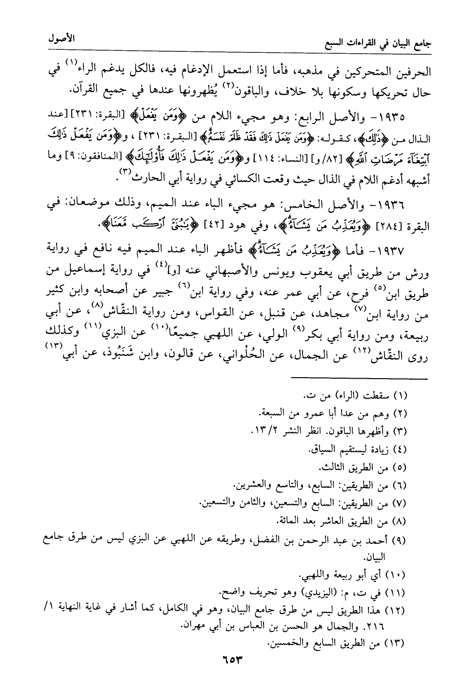 1935 - والأصل الرابع: وهو مجيء اللام من ومن يفعل [البقرة: 231] [عند الذال من ذلك، كقوله: ومن يفعل ذلك فقد ظلم نفسه [البقرة: 231]، وو من يفعل ذلك ابتغآء مرضات الله [82/ و] [النساء: 114] وو من يفعل ذلك فأولئك [المنافقون: 9] وما أشبهه أدغم اللام في الذال حيث وقعت الكسائي في رواية أبي الحارث «3».