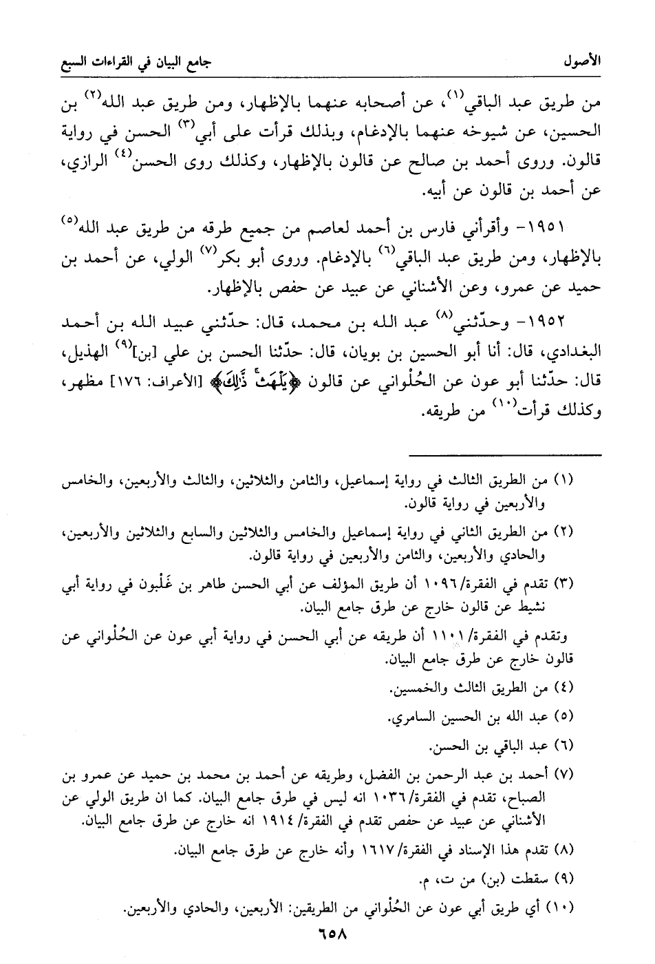 (7) أحمد بن عبد الرحمن بن الفضل، وطريقه عن أحمد بن محمد بن حميد عن عمرو بن الصباح، تقدم في الفقرة/ 1036 انه ليس في طرق جامع البيان. كما ان طريق الولي عن الأشناني عن عبيد عن حفص تقدم في الفقرة/ 1914 انه خارج عن طرق جامع البيان.