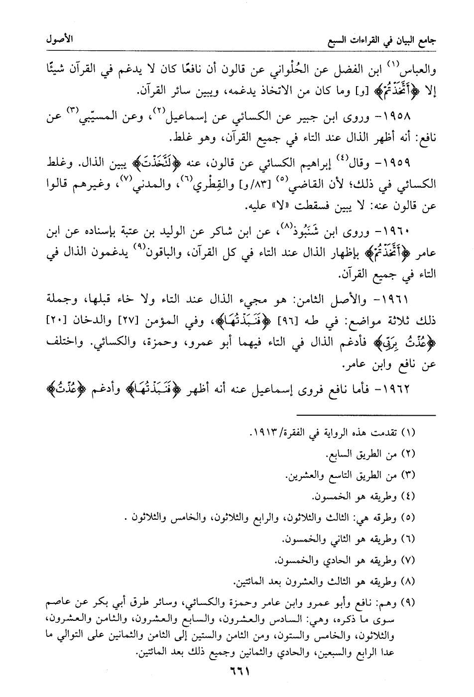 1961 - والأصل الثامن: هو مجيء الذال عند التاء ولا خاء قبلها، وجملة ذلك ثلاثة مواضع: في طه [96] فنبذتها، وفي المؤمن [27] والدخان [20] عذت بربّى فأدغم الذال في التاء فيهما أبو عمرو، وحمزة، والكسائي. واختلف عن نافع وابن عامر.