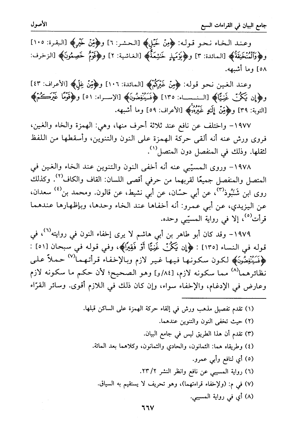 1978 - وروى المسيّبي عنه أنه أخفى النون والتنوين عند الخاء والغين في المتصل والمنفصل جميعا لقربهما من حرفي أقصى اللسان: القاف والكاف «2». وكذلك روى ابن شنبوذ «3»، عن أبي حسّان، عن أبي نشيط، عن قالون. ومحمد بن «4» سعدان، عن اليزيدي، عن أبي عمرو: أنه أخفاها عند الخاء وحدها، وبإظهارها عندهما قرأت «5»، إلا في رواية المسيّبي وحده.