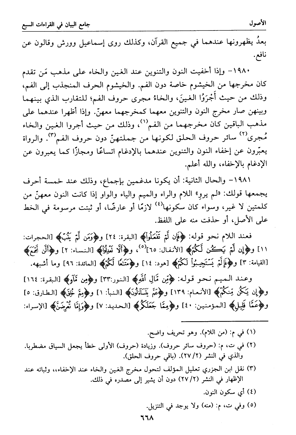 (3) نقل ابن الجزري تعليل المؤلف لتحول مخرج الغين والخاء عند الإخفاء،، وثباته عند الإظهار في النشر (2/ 27) دون أن يشير إلى مصدره في ذلك.