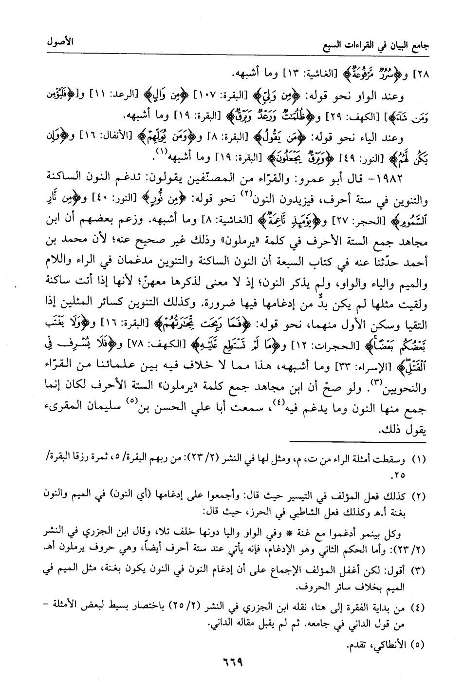 1982 - قال أبو عمرو: والقرّاء من المصنّفين يقولون: تدغم النون الساكنة والتنوين في ستة أحرف، فيزيدون النون «2» نحو قوله: من نّور [النور: 40] ومن نّار السّموم [الحجر: 27] ويومئذ نّاعمة [الغاشية: 8] وما أشبهه. وزعم بعضهم أن ابن مجاهد جمع الستة الأحرف في كلمة «يرملون» وذلك غير صحيح عنه؛ لأن محمد بن أحمد حدّثنا عنه في كتاب السبعة أن النون الساكنة والتنوين مدغمان في الراء واللام والميم والياء والواو، ولم يذكر النون؛ إذ لا معنى لذكرها معهنّ؛ لأنها إذا أتت ساكنة ولقيت مثلها لم يكن بدّ من إدغامها فيها ضرورة. وكذلك التنوين كسائر المثلين إذا التقيا وسكن الأول منهما، نحو قوله: فما ربحت تّجرتهم [البقرة: 16] وو لا يغتب بّعضكم بعضا [الحجرات: 12] وما لم تستطع عّليه [الكهف: 78] وفلا يسرف فّى القتل [الإسراء: 33] وما أشبهه، هذا مما لا خلاف فيه بين علمائنا من القرّاء والنحويين «3». ولو صحّ أن ابن مجاهد جمع كلمة «يرملون» الستة الأحرف لكان إنما جمع منها النون وما يدغم فيه «4»، سمعت أبا علي الحسن بن «5» سليمان المقرئ يقول ذلك.