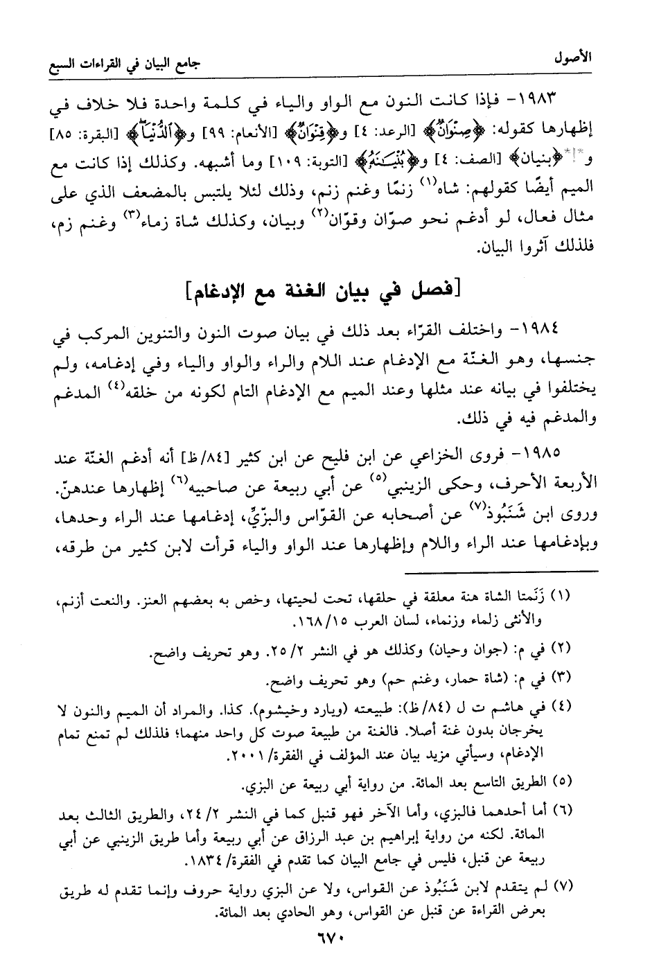 1984 - واختلف القرّاء بعد ذلك في بيان صوت النون والتنوين المركب في جنسها، وهو الغنّة مع الإدغام عند اللام والراء والواو والياء وفي إدغامه، ولم يختلفوا في بيانه عند مثلها وعند الميم مع الإدغام التام لكونه من خلقه «4» المدغم والمدغم فيه في ذلك.