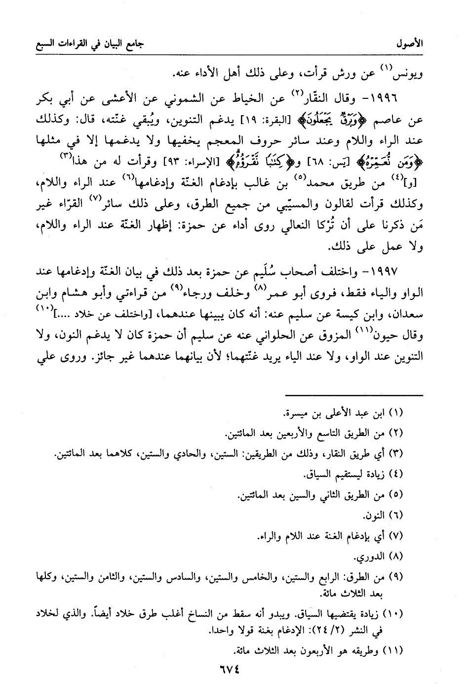 1997 - واختلف أصحاب سليم عن حمزة بعد ذلك في بيان الغنّة وإدغامها عند الواو والياء فقط، فروى أبو عمر «8» وخلف ورجاء «9» من قراءتي وأبو هشام وابن سعدان، وابن كيسة عن سليم عنه: أنه كان يبينها عندهما، [واختلف عن خلاد .... ] «10»