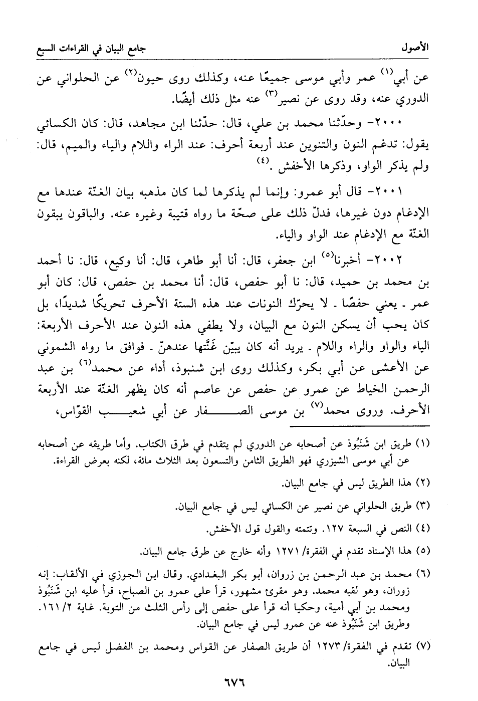 2002 - أخبرنا «5» ابن جعفر، قال: أنا أبو طاهر، قال: أنا وكيع، قال: نا أحمد بن محمد بن حميد، قال: نا أبو حفص، قال: أنا محمد بن حفص، قال: كان أبو عمر- يعني حفصا- لا يحرّك النونات عند هذه الستة الأحرف تحريكا شديدا، بل كان يحب أن يسكن النون مع البيان، ولا يطفي هذه النون عند الأحرف الأربعة:
