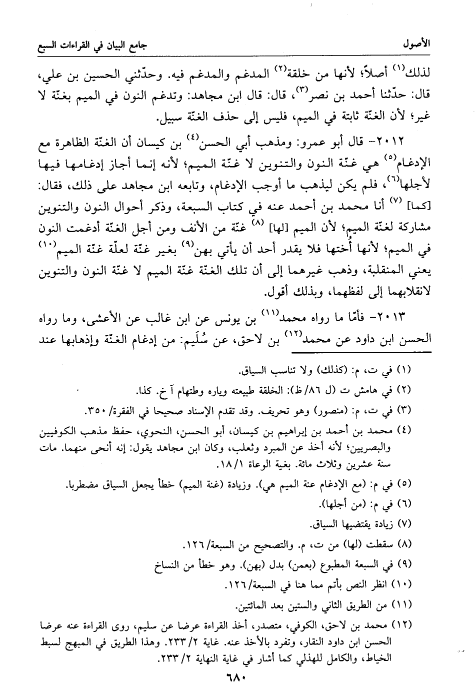 2013 - فأمّا ما رواه محمد «11» بن يونس عن ابن غالب عن الأعشى، وما رواه الحسن ابن داود عن محمد «12» بن لاحق، عن سليم: من إدغام الغنّة وإذهابها عند