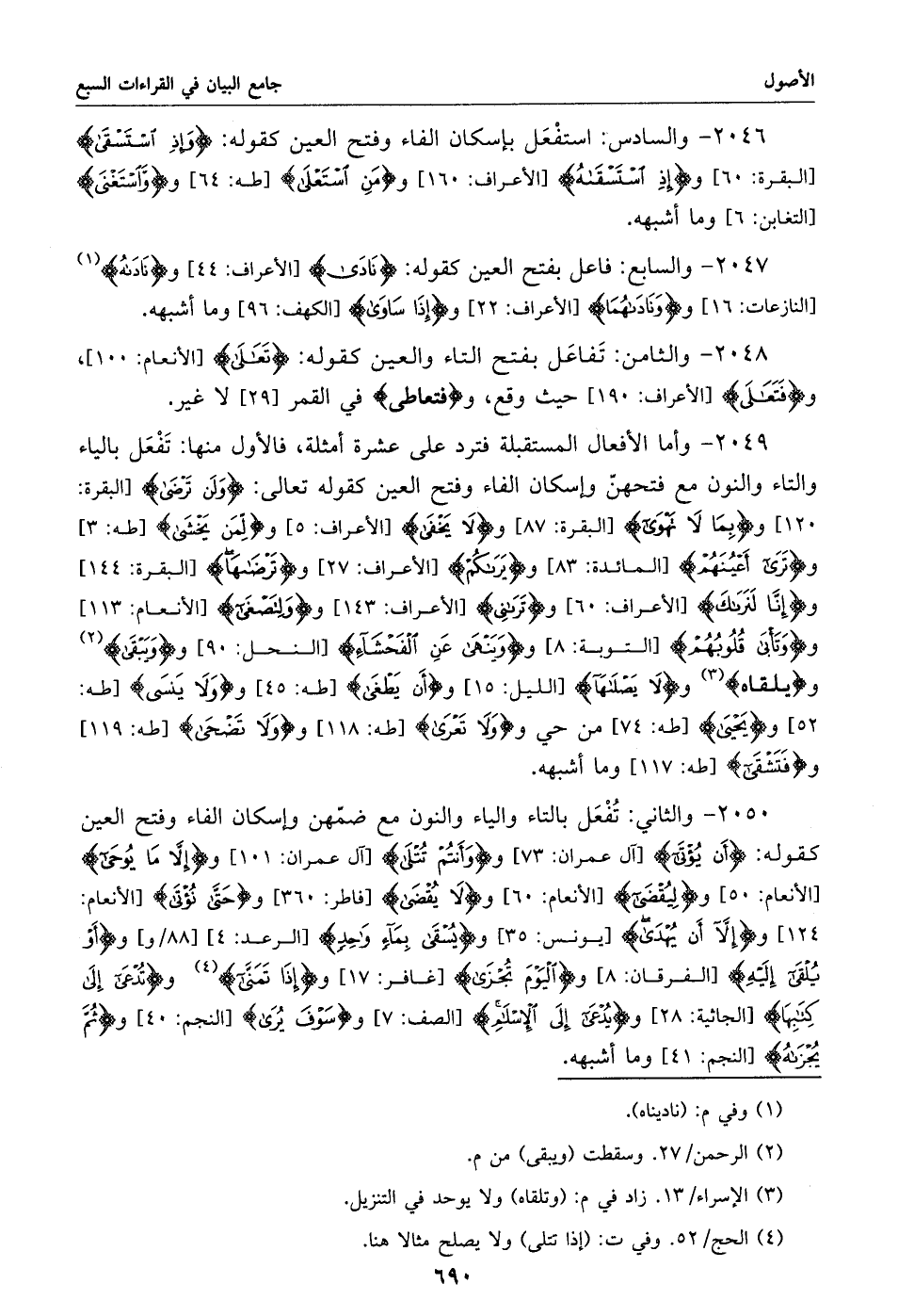 2050 - والثاني: تفعل بالتاء والياء والنون مع ضمّهن وإسكان الفاء وفتح العين كقوله: أن يؤتى [آل عمران: 73] وو أنتم تتلى [آل عمران: 101] وإلّا ما يوحى [الأنعام: 50] وليقضى [الأنعام: 60] ولا يقضى [فاطر: 360] وحتّى نؤتى [الأنعام: