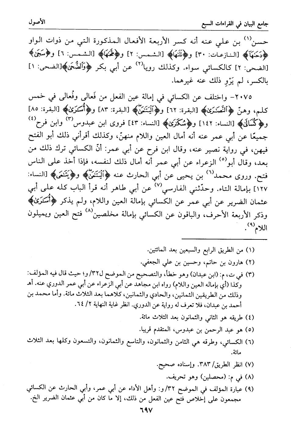 (9) عبارة المؤلف في الموضح 32/ و: وأهل الأداء عن أبي عمر، وأبي الحارث عن الكسائي مجمعون على إخلاص فتح عين الفعل من ذلك، إلا ما كان من أبي عثمان الضرير الخ.