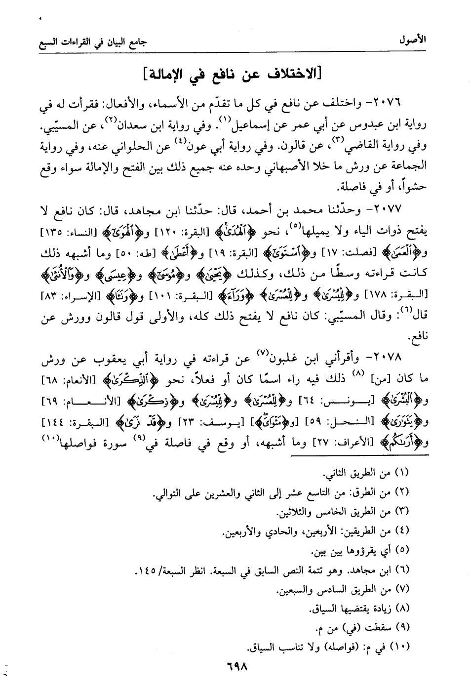 2076 - واختلف عن نافع في كل ما تقدّم من الأسماء، والأفعال: فقرأت له في رواية ابن عبدوس عن أبي عمر عن إسماعيل «1». وفي رواية ابن سعدان «2»، عن المسيّبي.