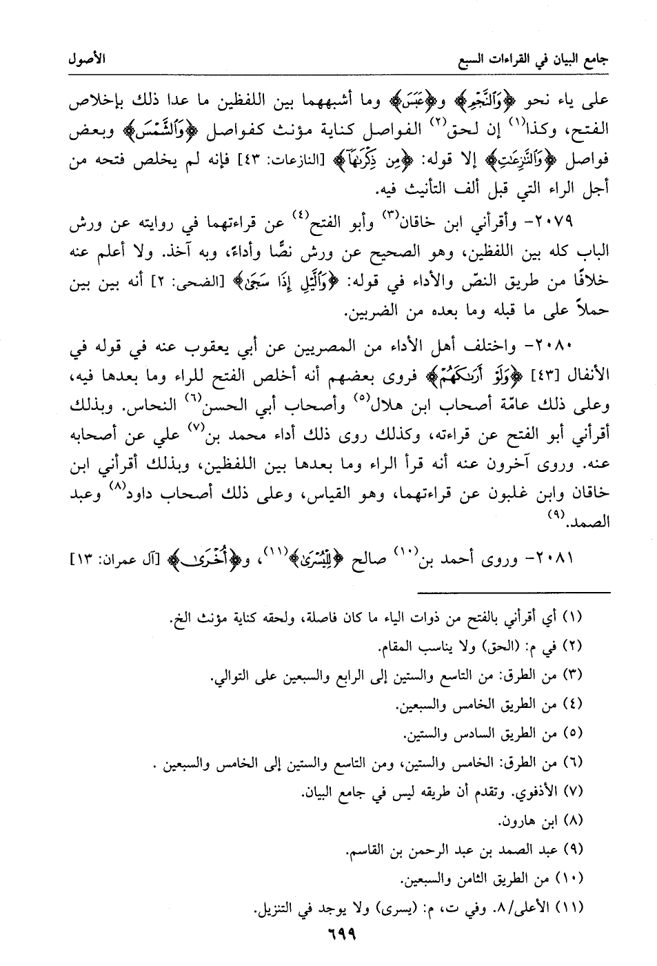 2079 - وأقرأني ابن خاقان «3» وأبو الفتح «4» عن قراءتهما في روايته عن ورش الباب كله بين اللفظين، وهو الصحيح عن ورش نصّا وأداء، وبه آخذ. ولا أعلم عنه خلافا من طريق النصّ والأداء في قوله: والّيل إذا سجى [الضحى: 2] أنه بين بين حملا على ما قبله وما بعده من الضربين.