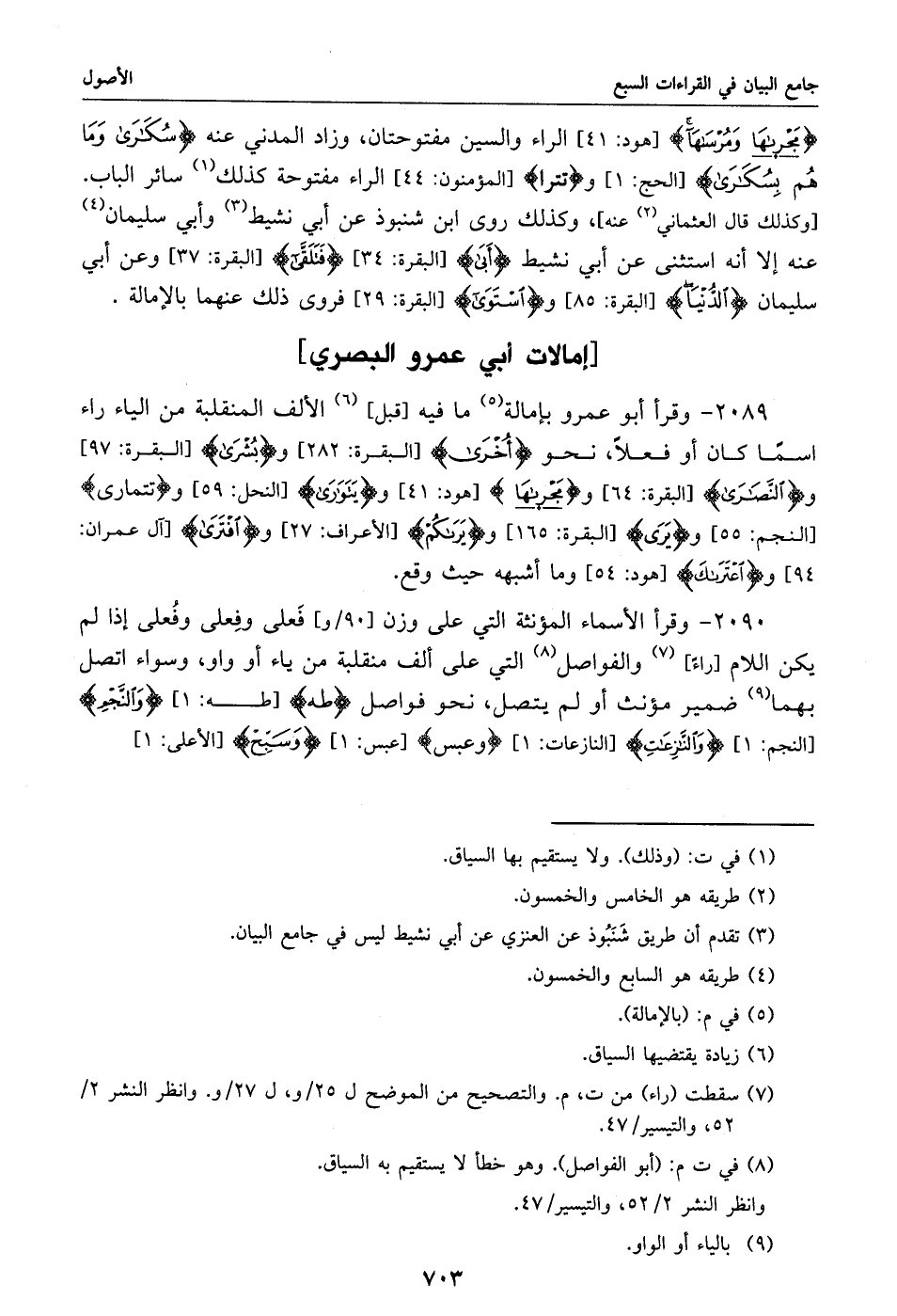 2090 - وقرأ الأسماء المؤنثة التي على وزن [90/ و] فعلى وفعلى وفعلى إذا لم يكن اللام [راء] «7» والفواصل «8» التي على ألف منقلبة من ياء أو واو، وسواء اتصل بهما «9» ضمير مؤنث أو لم يتصل، نحو فواصل طه [طه: 1] والنّجم [النجم: 1] والنّزعت [النازعات: 1] وعبس [عبس: 1] وسبّح [الأعلى: 1]