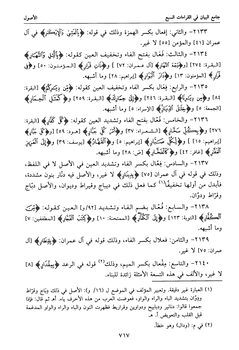 2139 - والثامن: فعلال بكسر الفاء، وذلك قوله في آل عمران: بقنطار [آل عمران: 75] لا غير.