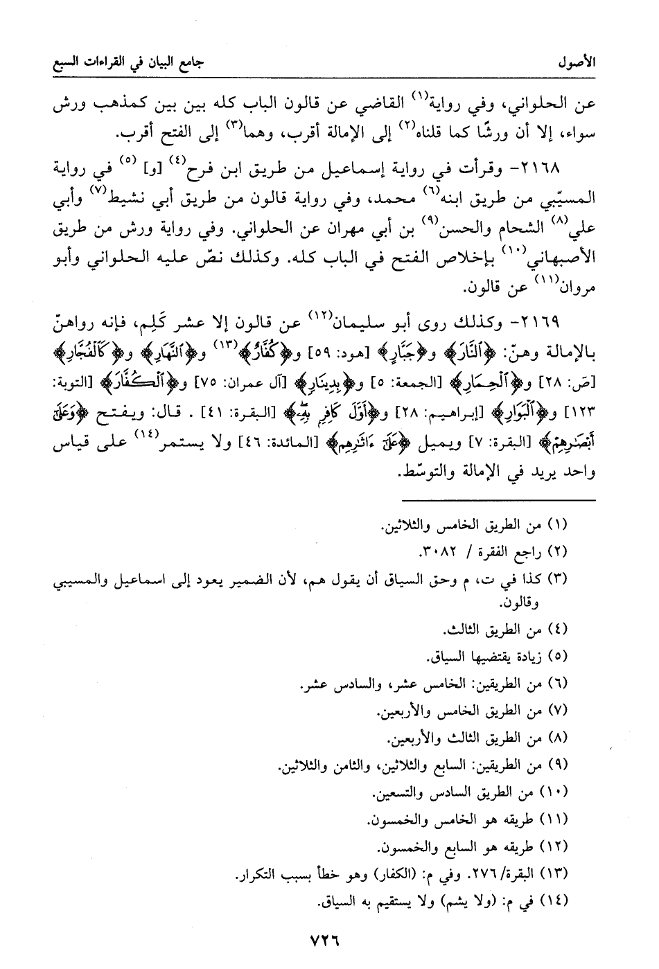 123] والبوار [إبراهيم: 28] وأوّل كافر به [البقرة: 41]. قال: ويفتح وعلى أبصرهم [البقرة: 7] ويميل على ءاثرهم [المائدة: 46] ولا يستمر «14» على قياس واحد يريد في الإمالة والتوسّط.