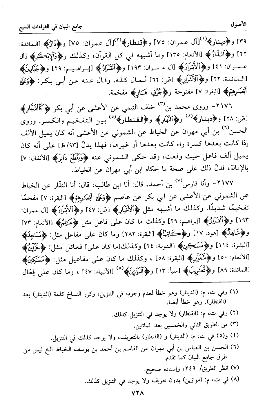 2176 - وروى محمد بن «3» خلف التيمي عن الأعشى عن أبي بكر كالفجّار [ص: 28] ودينار «4» والنّهار والقنطار «5» بين التفخيم والكسر. وروى الحسن «6» بن أبي مهران عن الخياط عن الشموني عن الأعشى أنه كان يميل الألف إذا كانت بعدها كسرة راء كانت بعدها أو غيرها، فهذا يدلّ [93/ ظ] على أنه كان يميل ألف فاعل حيث