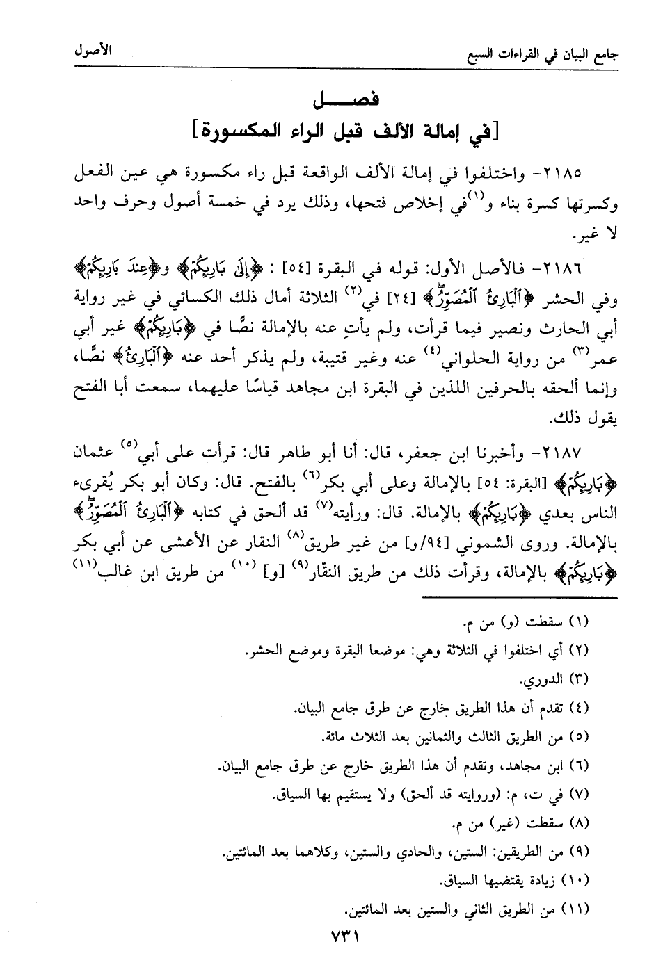 2185 - واختلفوا في إمالة الألف الواقعة قبل راء مكسورة هي عين الفعل وكسرتها كسرة بناء و «1» في إخلاص فتحها، وذلك يرد في خمسة أصول وحرف واحد لا غير.