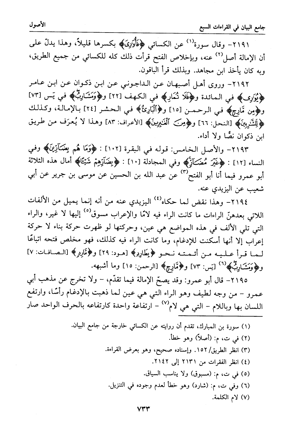 2192 - وروى أهل أصبهان عن الداجوني عن ابن ذكوان عن ابن عامر يورى في المائدة وفلا تمار في الكهف [22] وو مشارب في يس [73] ومن مّارج في الرحمن [15] والبارئ في الحشر [24] بالإمالة، وكذلك لّلشّربين [النحل: 66] ومن الغبرين [الأعراف: 83] وهذا لا يعرف من طريق ابن ذكوان نصّا ولا أداء.