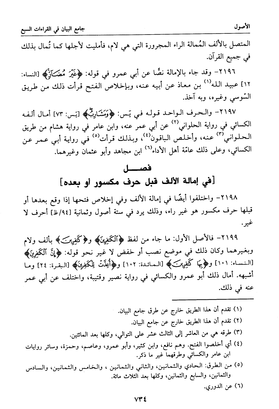 2198 - واختلفوا أيضا في إمالة الألف وفي إخلاص فتحها إذا وقع بعدها أو قبلها حرف مكسور هو غير راء، وذلك يرد في ستة أصول وثمانية [94/ ظ] أحرف لا غير.