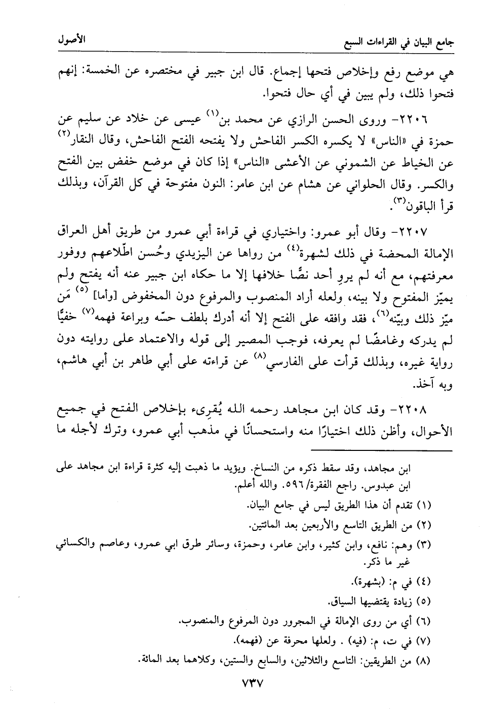 2208 - وقد كان ابن مجاهد رحمه الله يقرئ بإخلاص الفتح في جميع الأحوال، وأظن ذلك اختيارا منه واستحسانا في مذهب أبي عمرو، وترك لأجله ما