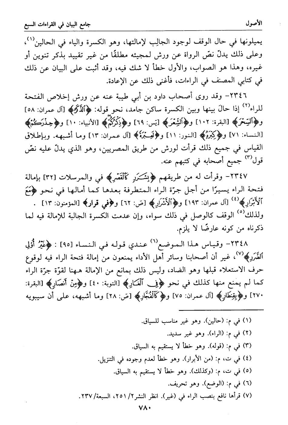 يميلونها في حال الوقف لوجود الجالب لإمالتها، وهو الكسرة والياء في الحالين «1»، وعلى ذلك يدلّ نصّ الرواة عن ورش لمجيئه مطلقا من غير تقييد بذكر تنوين أو غيره، وهذا هو الصواب، والأول خطأ لا شك فيه، وقد أثبت على البيان عن ذلك في كتابي المصنف في الراءات، فأغنى ذلك عن الإعادة.