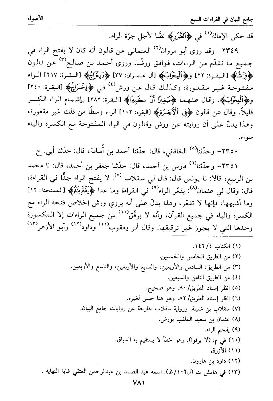 2351 - وحدّثنا «6» فارس بن أحمد، قال: حدّثنا جعفر بن أحمد، قال: نا محمد بن الربيع، قالا: نا يونس قال: قال لي سقلاب «7»: لا يفتح الراء جدّا في القراءة، قال: وقال لي عثمان «8»: يقعّر الراء «9» في القراءة وما عدا يفترينه [الممتحنة: 12] وما أشبهها، فإنها لا تقعّر، وهذا يدلّ على أنه يروي ورش إخلاص فتحة الراء مع الكسرة والياء في جميع القرآن، وأنه لا يرقّق «10» من جميع الراءات إلا المكسورة وحدها التي لا يجوز غير ترقيقها. وقال أبو يعقوب «11» وداود «12» وأبو الأزهر «13»