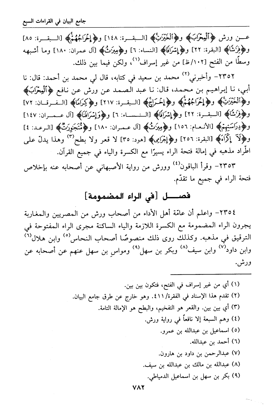 2352 - وأخبرني «2» محمد بن سعيد في كتابه، قال لي محمد بن أحمد: قال: نا أبي، نا إبراهيم بن محمد، قال: نا عبد الصمد عن ورش عن نافع المحراب والخيرت وإخراجهم وإخراج [البقرة: 217] وكراما [الفرقان: 72] وفرشا [البقرة: 22] وإسرافا [النساء: 6] وو إسرافنا [آل عمران: 147] ودراستهم [الأنعام: 156] وميرث [آل عمران: 180] ومّتجورت [الرعد: 4] ولآ إكراه [البقرة: 256] وإجرامى [هود: 35] لا قعر ولا بطح «3» وهذا يدلّ على اطّراد مذهبه في إمالة فتحة الراء يسيرا مع الكسرة والياء في جميع القرآن.
