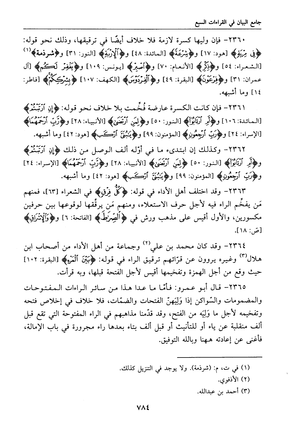 2364 - وقد كان محمد بن علي «2» وجماعة من أهل الأداء من أصحاب ابن هلال «3» وغيره يروون عن قرّائهم ترقيق الراء في قوله: بين المرء [البقرة: 102] حيث وقع من أجل الهمزة وتفخيمها أقيس لأجل الفتحة قبلها، وبه قرأت.