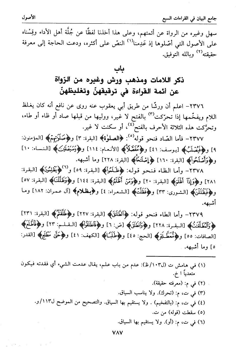 2376 - اعلم أن ورشا من طريق أبي يعقوب عنه روى عن نافع أنه كان يغلظ اللام ويفخّمها إذا تحرّكت «3» بالفتح لا غير، ووليها من قبلها صاد أو ظاء أو طاء، وتحرّكت هذه الثلاثة الأحرف بالفتح «4»، أو سكنت لا غير.
