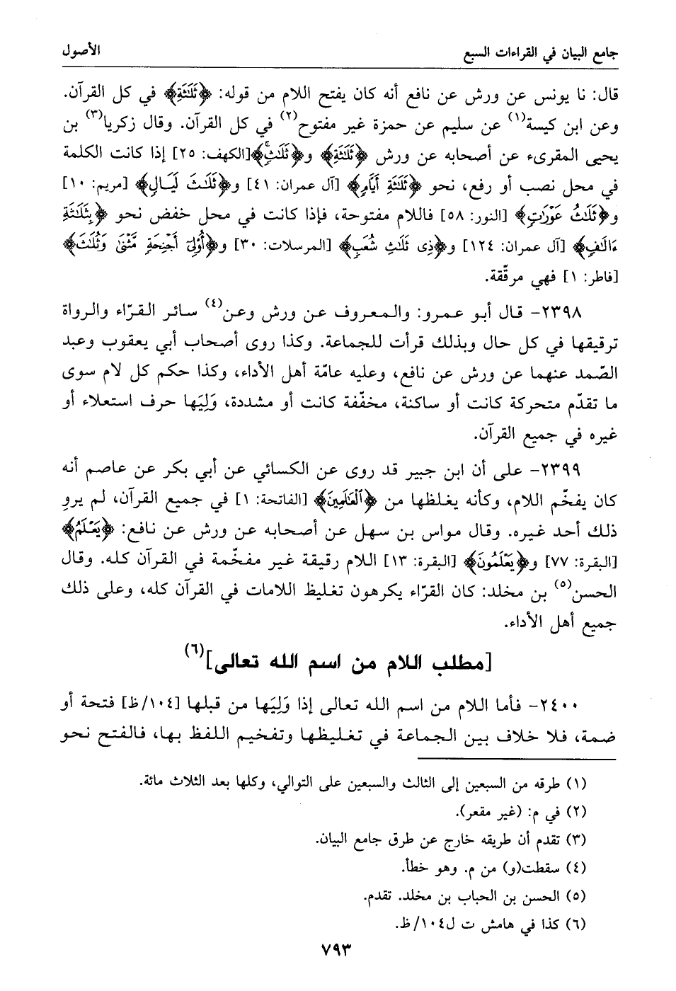 2399 - على أن ابن جبير قد روى عن الكسائي عن أبي بكر عن عاصم أنه كان يفخّم اللام، وكأنه يغلظها من العلمين [الفاتحة: 1] في جميع القرآن، لم يرو ذلك أحد غيره.