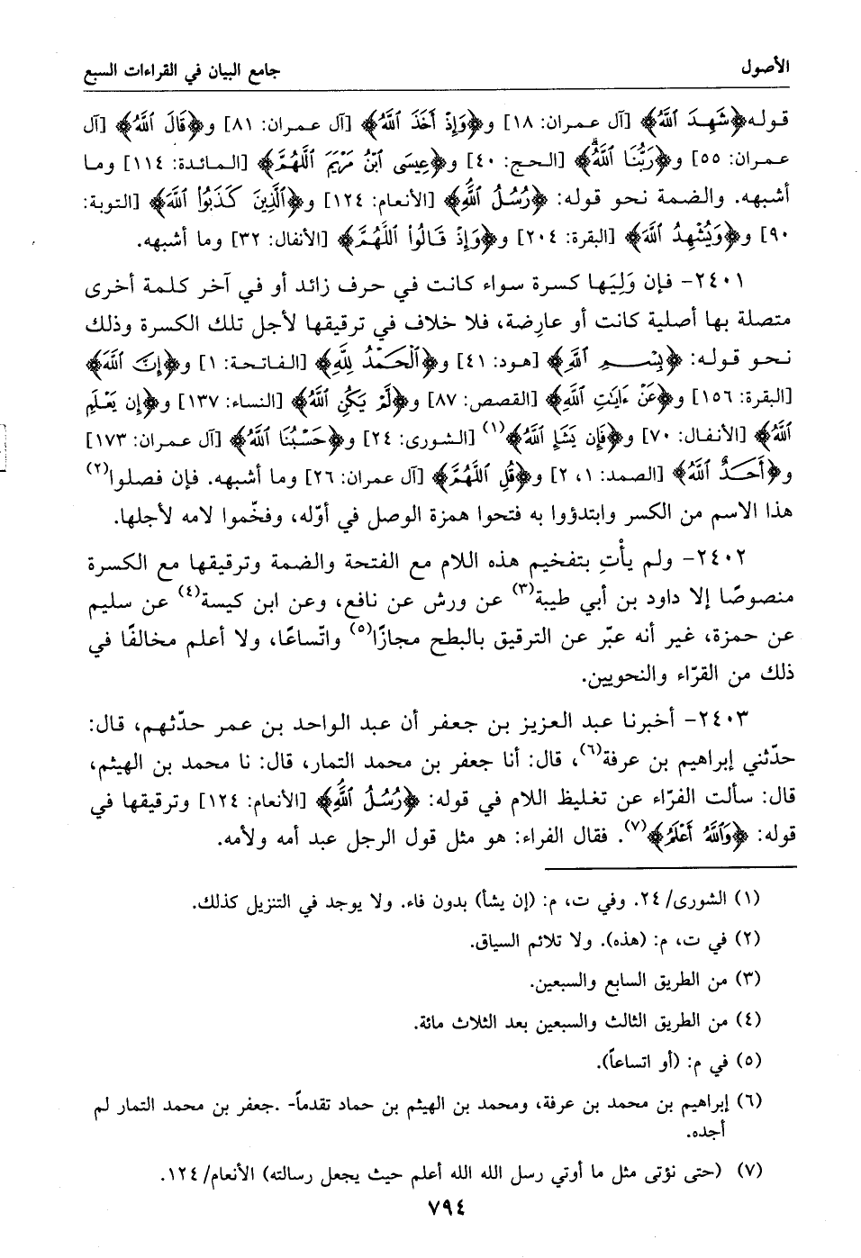 2402 - ولم يأت بتفخيم هذه اللام مع الفتحة والضمة وترقيقها مع الكسرة منصوصا إلا داود بن أبي طيبة «3» عن ورش عن نافع، وعن ابن كيسة «4» عن سليم عن حمزة، غير أنه عبّر عن الترقيق بالبطح مجازا «5» واتّساعا، ولا أعلم مخالفا في ذلك من القرّاء والنحويين.