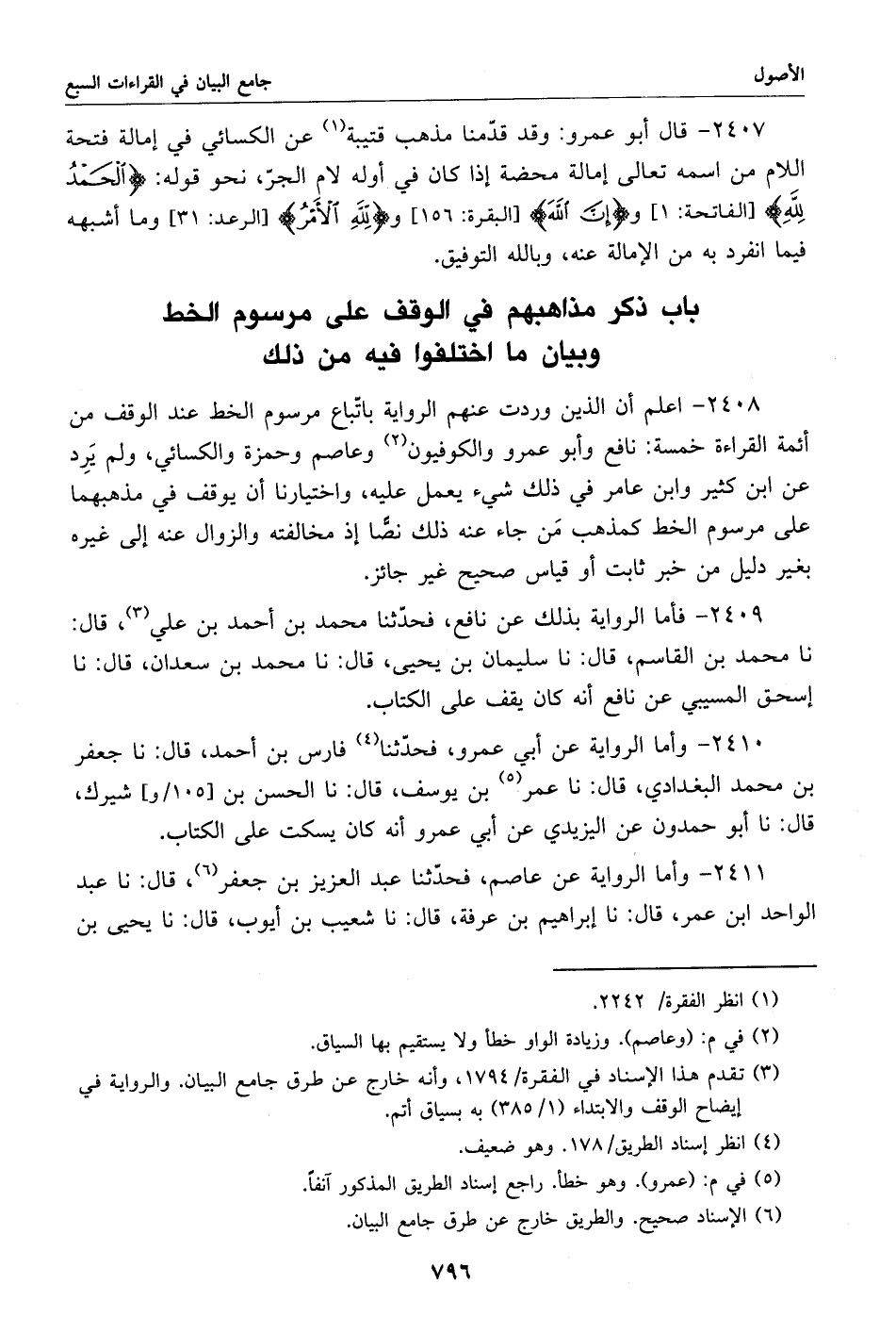 2408 - اعلم أن الذين وردت عنهم الرواية باتّباع مرسوم الخط عند الوقف من أئمة القراءة خمسة: نافع وأبو عمرو والكوفيون «2» وعاصم وحمزة والكسائي، ولم يرد عن ابن كثير وابن عامر في ذلك شيء يعمل عليه، واختيارنا أن يوقف في مذهبهما على مرسوم الخط كمذهب من جاء عنه ذلك نصّا إذ مخالفته والزوال عنه إلى غيره بغير دليل من خبر ثابت أو قياس صحيح غير جائز.